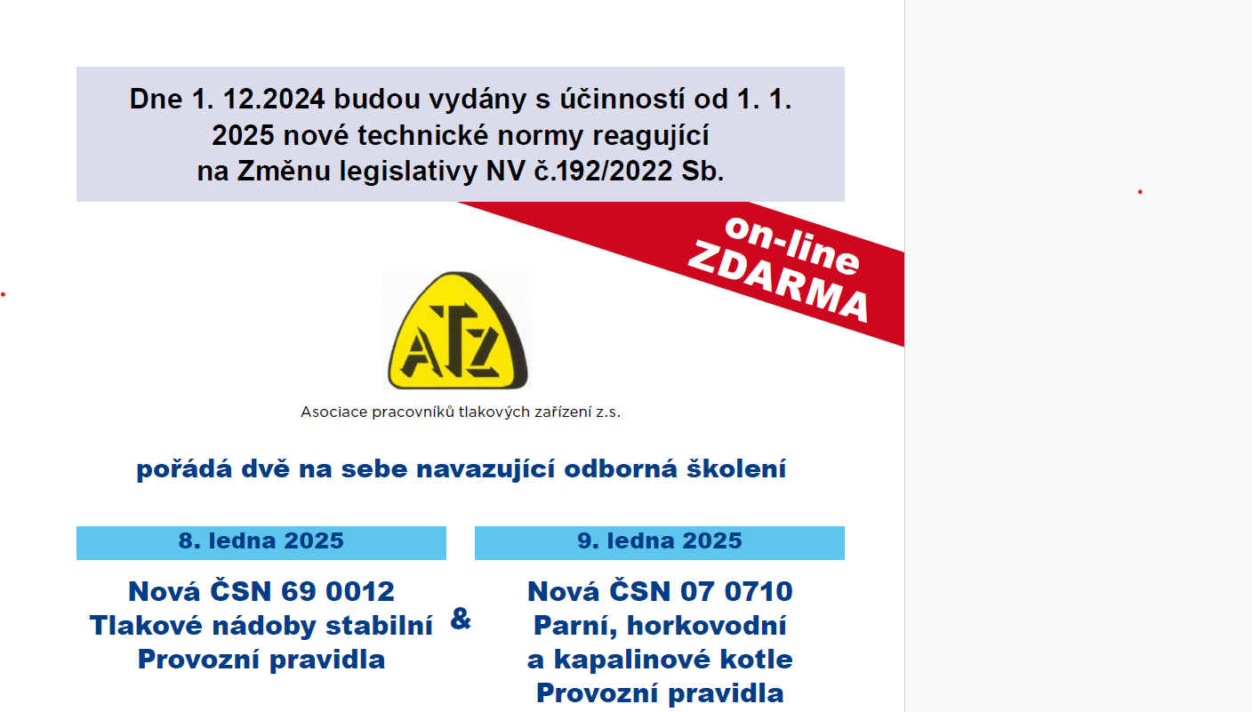 ATZ pořádá odborná školení k ČSN 690012 a ČSN 070710 v termínu 8. a 9. ledna 2025 ATZ pořádá ve spolupráci s agenturou KAPKA PLUS […]