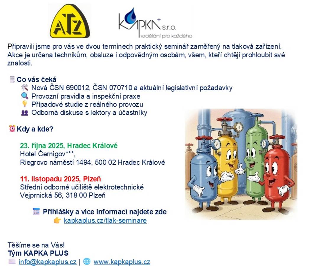 Odborné školení je zaměřeno na platnou legislativu v oblasti vyhrazených tlakových zařízení, provozování tlakových nádob stabilních a rizika s tímto provozem spojená.